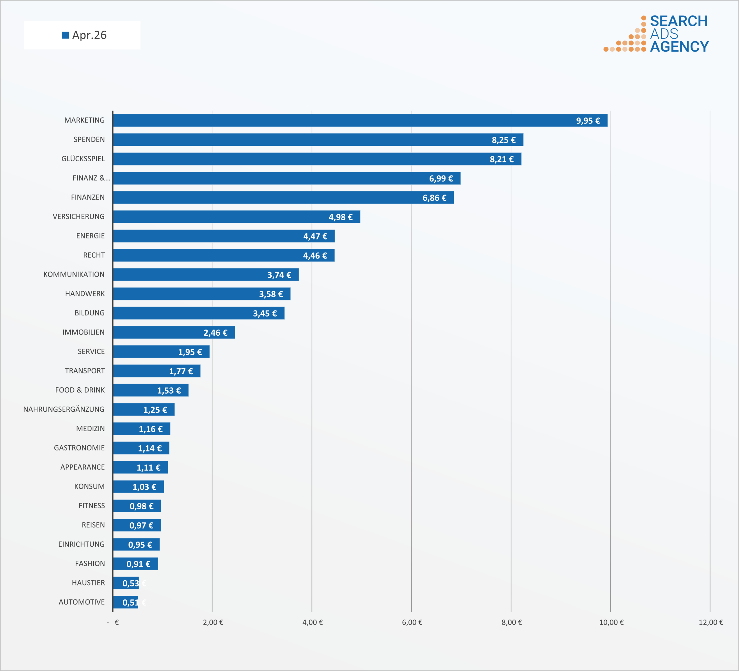 Marketing ist die teuerste aller beobachteten Branchen. Besonders Agenturen, die auf den Begriff „google ads agentur“ bieten, müssen mit satten 40,05 € pro Klick sehr tief in die Tasche greifen. Auch andere Begriffe im Agenturumfeld bleiben kostspielig: „typo3 agentur“ liegt bei 24,85 €, „wordpress agentur“ bei 22,51 € und „seo agentur“ bei 18,89 €. Wer als Agentur wirtschaftlich Kundenakquise machen will, muss hier entsprechend große Aufträge generieren. - Spenden