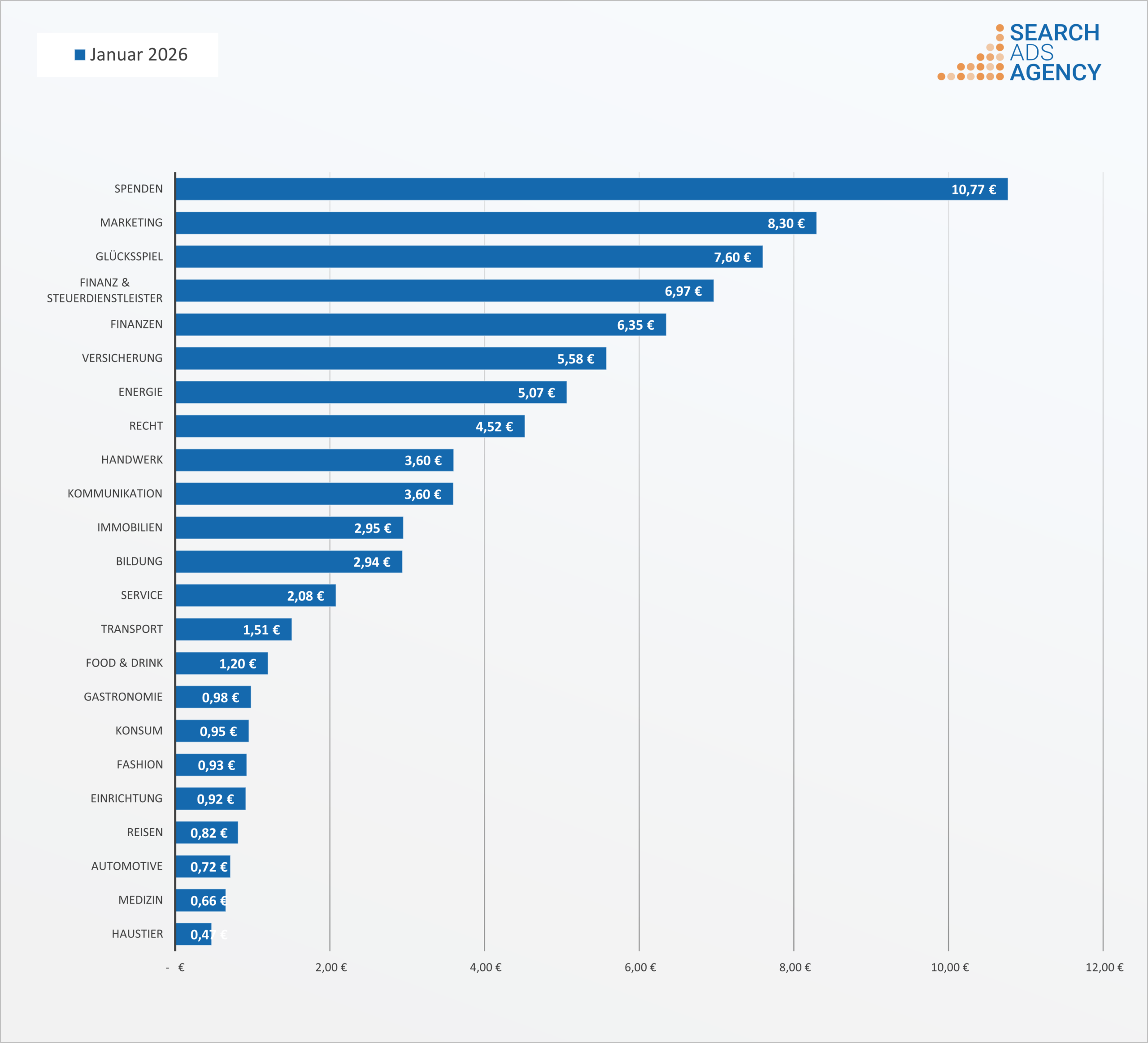 Zur Berechnung der Durchschnittswerte in jeder Branche addieren wir die Kosten pro Klick für alle Branchen-Suchbegriffe und teilen die Summe durch die Anzahl der beobachteten Suchbegriffe der Branche. Der Mittelwert dient dabei ausschließlich der Vergleichbarkeit zwischen Branchen.